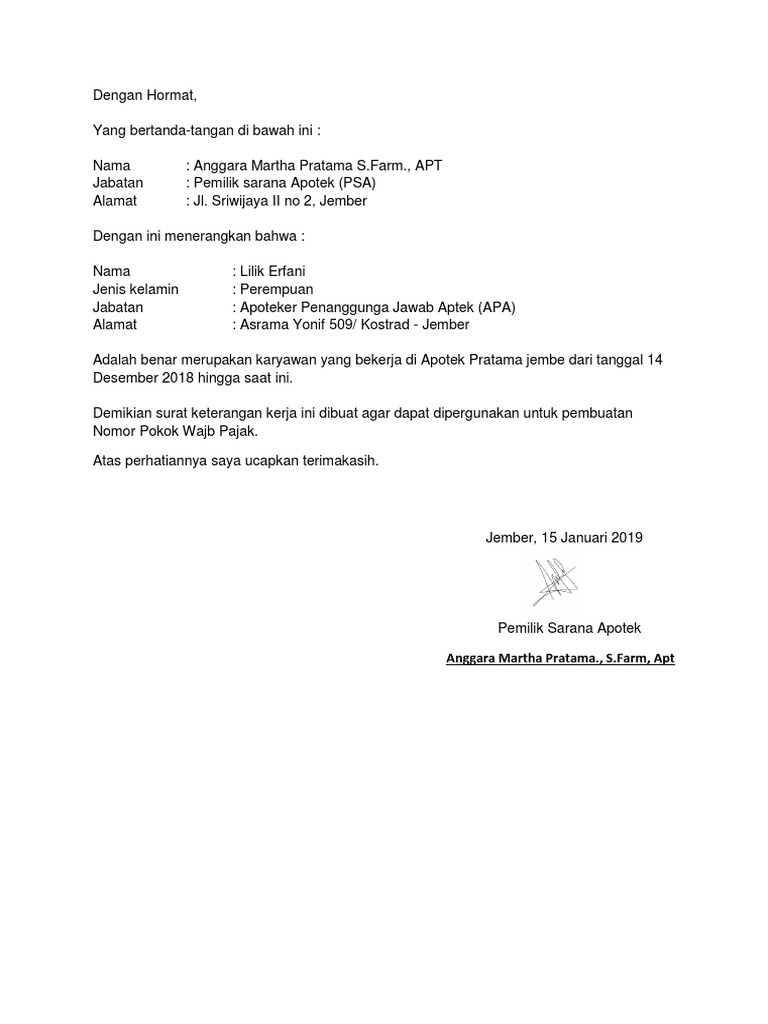 Contoh Surat Pernyataan Kerja Di Apotek : 14 Contoh Surat Keterangan Bekerja Di Apotek / Contoh surat lamaran kerja, contoh cv menarik, lowongan kerja, loker cikarang, loker karawang, info loker, lowongan pekerjaan bersama surat ini saya ingin melamar sebagai apoteker di apotek ini.. Contoh surat pernyataan ceraijuga dibutuhkan untuk mengetahui cara membuat surat pernyataan. Contoh surat pernyataan resmi sangat penting untuk menunjukkan keseriusan dan kebenaran suatu fakta serta untuk tugas dan hal yang penting. Contoh surat lamaran apotek ini digunakan untuk melamar pekerjaan menjadi seorang karyawan atau pegawai di apotek dan merupakan contoh surat yang baik dan. Kepala balai pom/tim dinkes kab/kota. Surat pernyataan diperlukan untuk keadaan tertentu seperti melamar pekerjaan.
